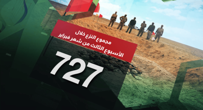أعلنت غرفة عمليات مشروع مسام أن الفرق الميدانية نزعت خلال الأسبوع الماضي 727 لغماً وذخيرة غير منفجرة وعبوة ناسفة، ليصل بذلك مجموع ما تم نزعه منذ بداية الشهر وحتى 23 منه 2279.