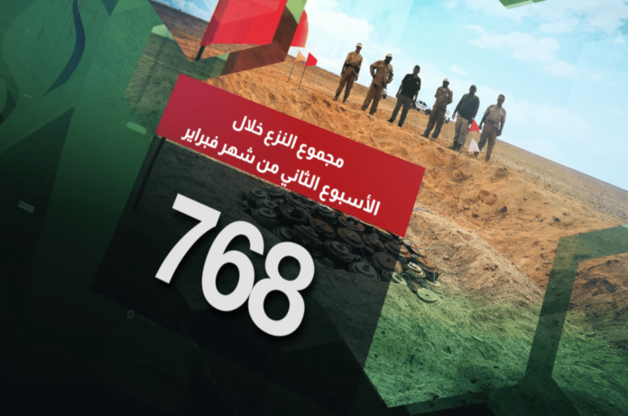 أعلنت غرفة عمليات مشروع مسام أن الفرق الميدانية نزعت خلال الأسبوع الماضي 768 لغماً وذخيرة غير منفجرة وعبوة ناسفة، ليصل بذلك مجموع ما تم نزعه منذ بداية الشهر وحتى 16 منه 1552.