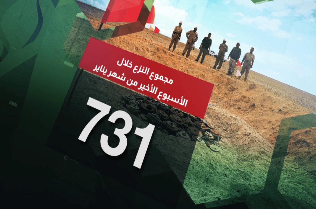 أعلنت غرفة عمليات مشروع مسام أن الفرق الميدانية نزعت خلال الأسبوع الماضي 731 لغماً وذخيرة غير منفجرة وعبوة ناسفة، ليصل بذلك مجموع ما تم نزعه خلال شهر يناير 4245.