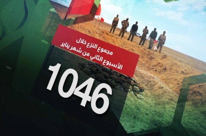 أعلنت غرفة عمليات مشروع مسام أن الفرق الميدانية نزعت خلال الأسبوع الماضي 1046 لغماً وذخيرة غير منفجرة وعبوة ناسفة، ليصل مجموع ما تم نزعه منذ بداية الشهر 1771.