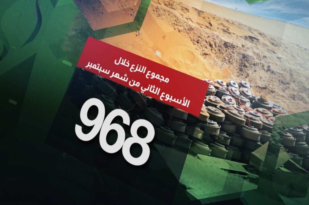 أعلنت غرفة عمليات مشروع مسام أن الفرق الميدانية نزعت خلال الأسبوع الثاني من شهر سبتمبر 968 لغماً وذخيرة غير منفجرة وعبوة ناسفة ليصل بذلك مجموع ما تم نزعه منذ بداية الشهر 1751.