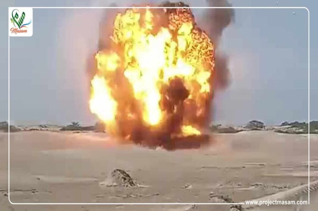 نفذ مشروع مسام لتطهير الأراضي اليمنية من الألغام عملية إتلاف وتفجير لـ1316 لغم وذخيرة غير منفجرة عبوة ناسفة في باب المندب.