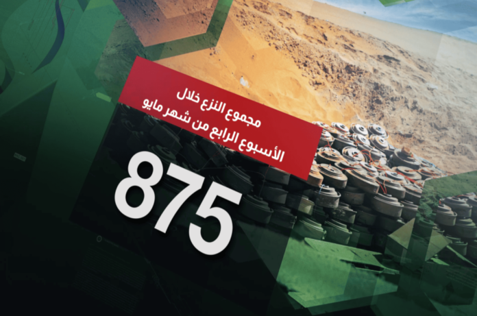 أعلنت غرفة عمليات مشروع مسام أن الفرق الميدانية نزعت الأسبوع الماضي 875 لغماً وذخيرة غير منفجرة وعبوة ناسفة ليصل بذلك مجموع ما تم نزعه منذ بداية هذا الشهر 3989.