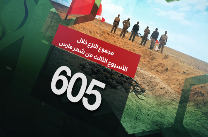 أعلنت غرفة عمليات مشروع مسام أن الفرق الميدانية نزعت الأسبوع الماضي 605 لغماً وذخيرة غير منفجرة وعبوة ناسفة ليصل بذلك مجموع ما تم نزعه منذ بداية الشهر 2512.