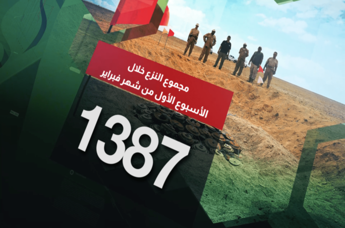 أعلنت غرفة عمليات مشروع مسام أن الفرق الميدانية نزعت الأسبوع الماضي 1387 لغماً وذخيرة غير منفجرة وعبوة ناسفة.