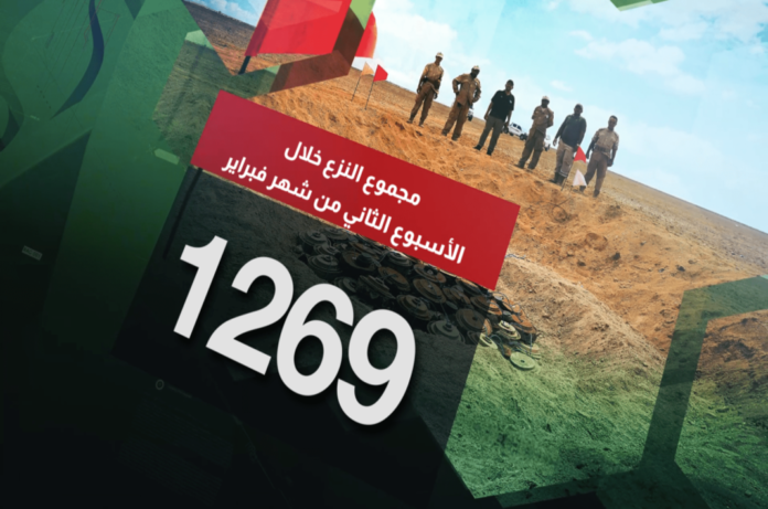 أعلنت غرفة عمليات مشروع مسام أن الفرق الميدانية نزعت الأسبوع الماضي 1269 لغماً وذخيرة غير منفجرة وعبوة ناسفة ليصل بذلك مجموع ما تم نزعه منذ بداية الشهر 2656.