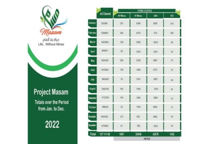 خلال 2022.. مسام ينزع 78753 لغماً وذخيرة غير منفجرة وعبوة ناسفة