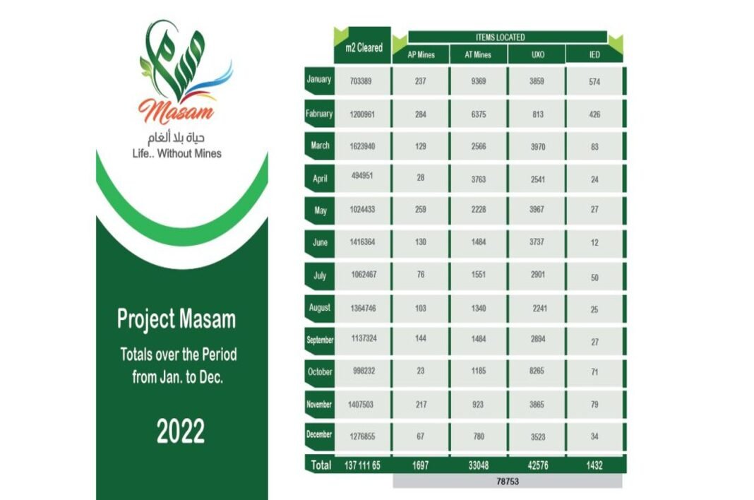 وذكر القصيبي في بيانه أن فرق مسام تمكنت خلال العام 2022 من تطهير 13.711.165 متراً مربعاً من الأراضي اليمنية كانت مفخخة بالألغام والذخائر غير المنفجرة والعبوات الناسفة.