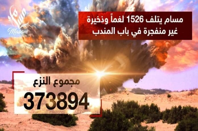 أعلن مدير عام مشروع مسام الأستاذ أسامة القصيبي أن فرق المشروع نزعت حتى يوم 25 نوفمبر الجاري 373.894 لغماً وذخيرة غير منفجرة وعبوة ناسفة.
