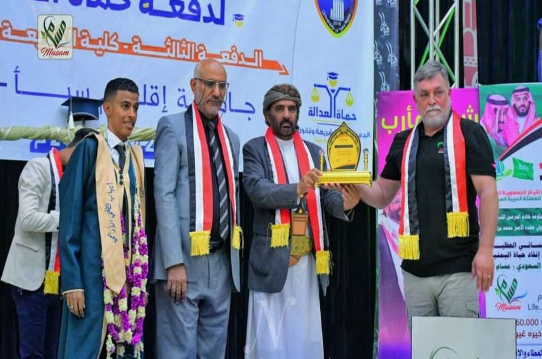 وفي الفعالية التي أقامها أكاديميون وناشطون في جامعة إقليم سبأ في مأرب بمناسبة العيد الستين لقيام الجمهورية اليمنية واليوم الوطني الثاني والتسعين للمملكة سلم وكيل محافظة مأرب عبدالله الباكري الدرعين لمدير مشروع «مسام» أسامة القصيبي، مشيدين بالنجاحات التي حققها المشروع في إنقاذ حياة اليمنيين من الموت المدفون تحت الأرض (الألغام). وأعرب وكيل محافظة مأرب عبد الله الباكري عن شكره للمملكة قيادة وشعباً على مواقفها الإنسانية والأخوية تجاه الشعب اليمني، مؤكداً أن المملكة بقيادة خادم الحرمين الشريفين الملك سلمان بن عبدالعزيز، وولي عهده الأمير محمد بن سلمان، سطرت مواقف بطولية وإنسانية عظيمة لإنقاذ الروح البشرية من الهلاك على أيدي عصابات الحوثي الإيرانية.