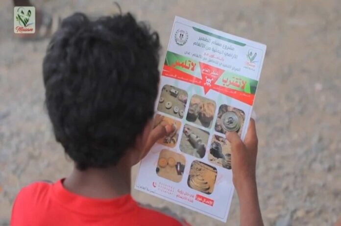 وقد وزعت عناصر من فرق مسام قصاصات توضيحية لأنواع من الألغام وأشكالها وطرق تمويهها تحت مسمى تحذيري كبير وبارز عنوانه “لا تقترب ..لا تلمس”.